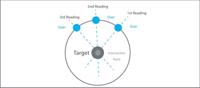 還有另 種更準確定位目標點的方法,(Square 方法)取 4 從 4 個角度對目標的不同讀數形成距離目標點 3m 的正方形 讀數的交點是目標點。