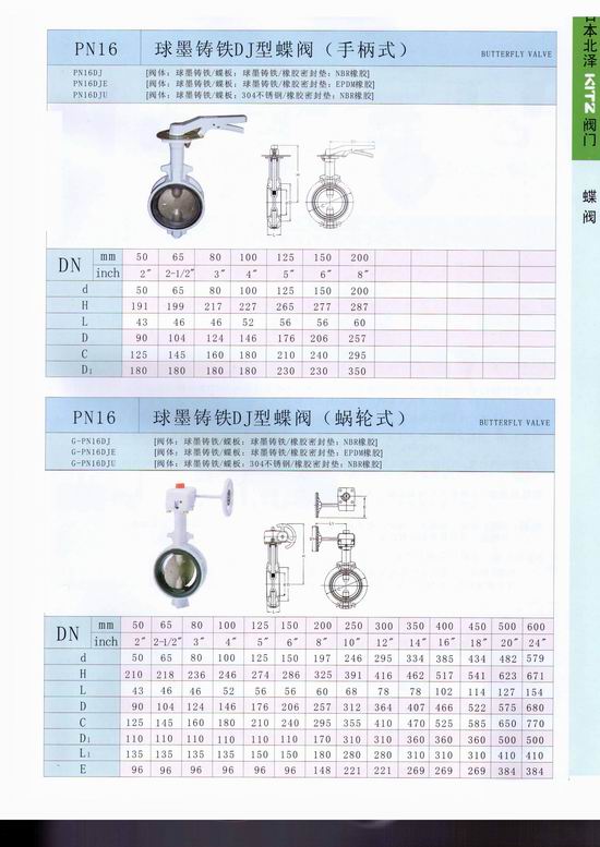 日本北澤KITZ渦輪蝶閥不僅結構簡單、體積小、重量輕、材料耗用省,安裝尺寸小,而且驅動力矩小,操作簡便、迅速,并且還同時具有良好的流量調節功能和關閉密封特性,在大中口徑、中低壓力的使用領域,蝶閥是主導的閥門形式。手柄式 型號:PN16DJ (球墨鑄鐵蝶板) 蝸輪式 :G-PN16DJ (球墨鑄鐵蝶板) PN16DJU (不銹鋼蝶板) G-PN16DJU (不銹鋼蝶板)